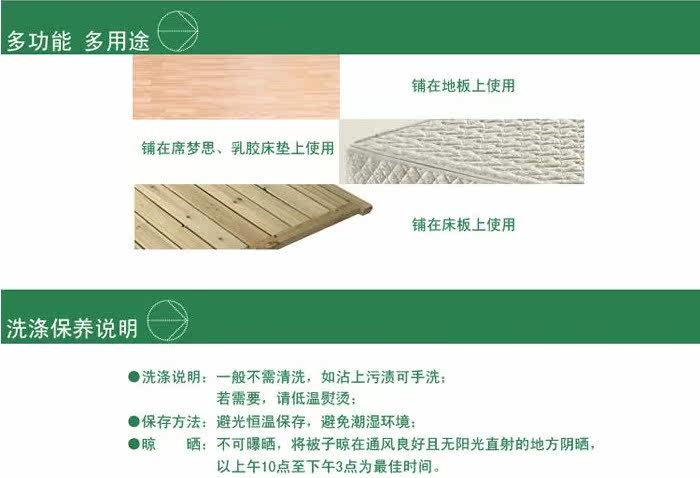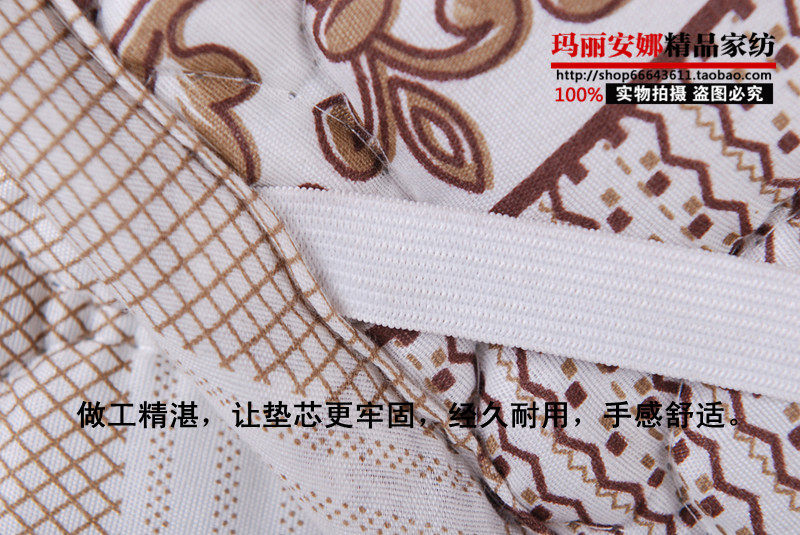 生产工艺 | 床垫面料采用涤纶布,填充物为整张洁白柔丝棉,电脑绗缝而成,不变形,不出棉。床垫反面四个角有松紧皮筋,可套在席梦思上面反正滑动,易于折叠存储空间小并且方便外出时携带。 | ||||